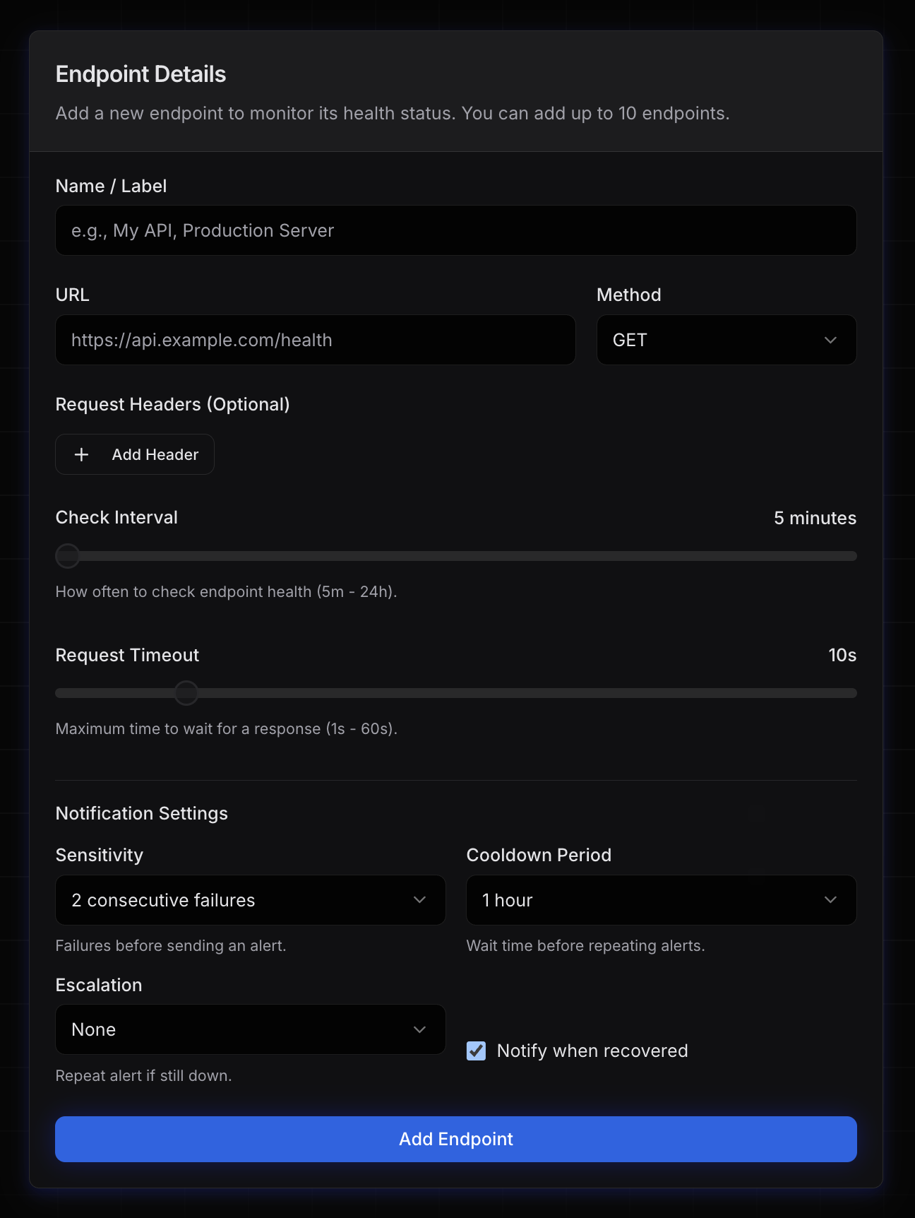 Once logged in, click the "Add Endpoint" button on your dashboard. You'll need to provide:
