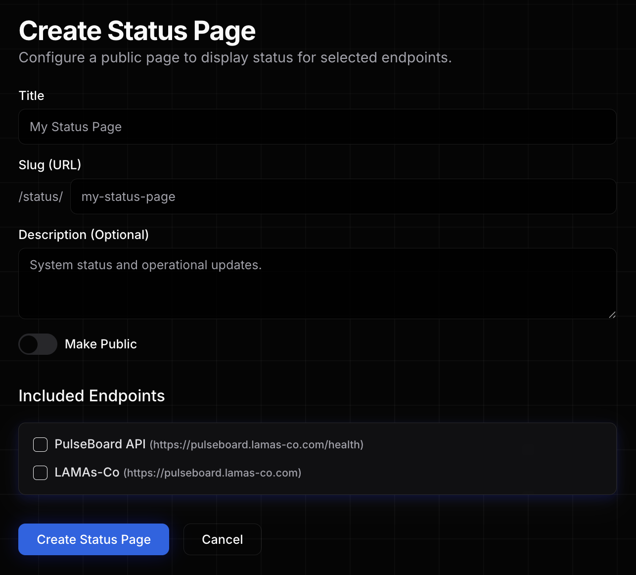 Go to the Status Pages tab in your dashboard and click "Create New Page". A Status Page can display one or multiple endpoints.